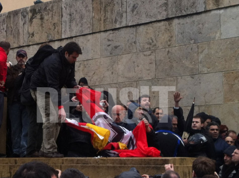 Την ώρα της έντασης κάποιοι έκαψαν την γερμανική σημαία. Ο κόσμος αυτή την ώρα φωνάζει "παραιτήσου - παραιτήσου" και ενισχύονται οι αστυνομικές δυνάμεις.